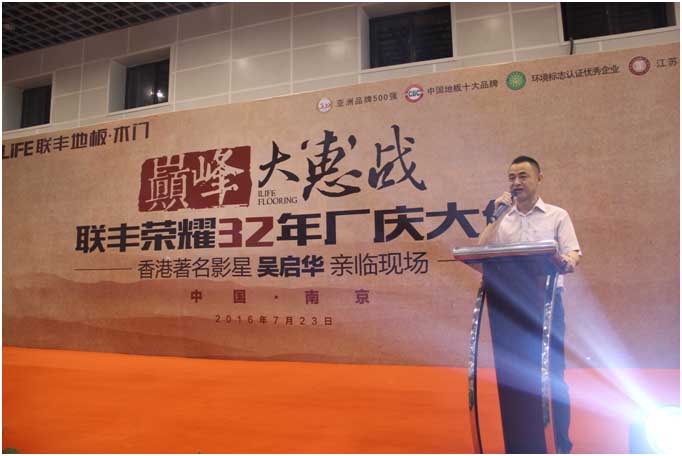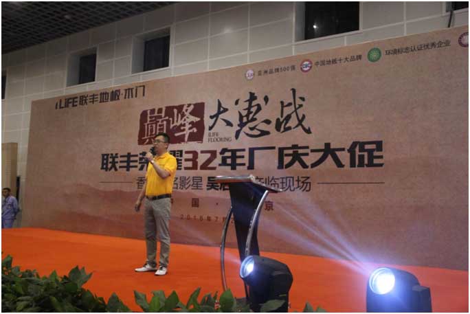 2016年7月23日,巔峰大惠戰(zhàn)——聯(lián)豐地板榮耀32年廠慶大促在六朝古都南京弘陽(yáng)會(huì)展中心隆重舉行,蘇州聯(lián)豐木業(yè)有限公司董事長(zhǎng)沈建新、總經(jīng)理李玉明等企業(yè)高層領(lǐng)導(dǎo)出席了本次盛會(huì)。同時(shí),本次活動(dòng)還邀請(qǐng)了香港著名影星吳啟華親臨現(xiàn)場(chǎng)加油助陣。江蘇衛(wèi)視、南京電視臺(tái)、中華地板網(wǎng)、搜狐家居、新浪家居等新聞媒體見證活動(dòng)盛況。