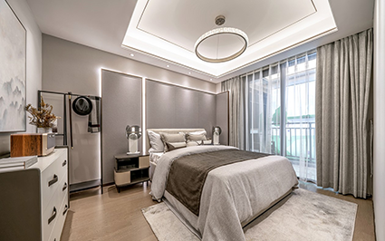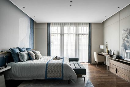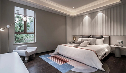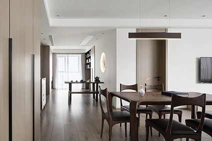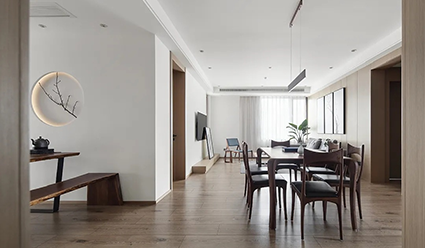 原木色空間十分貼合新中式的“刪繁就簡(jiǎn)”的特點(diǎn),木材原生的肌理與色彩展現(xiàn)自然與舒適,與原木色略帶節(jié)疤效果的地板和線條簡(jiǎn)約的家居搭配,輕松營造出自然愜意、受文藝青年喜愛的禪意效果。