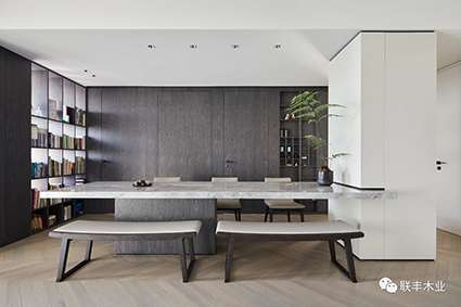 相對于客廳的喧囂熱鬧,書房則多了幾分靜謐安逸的氣韻,適合三五貼心好友喝茶傾談。