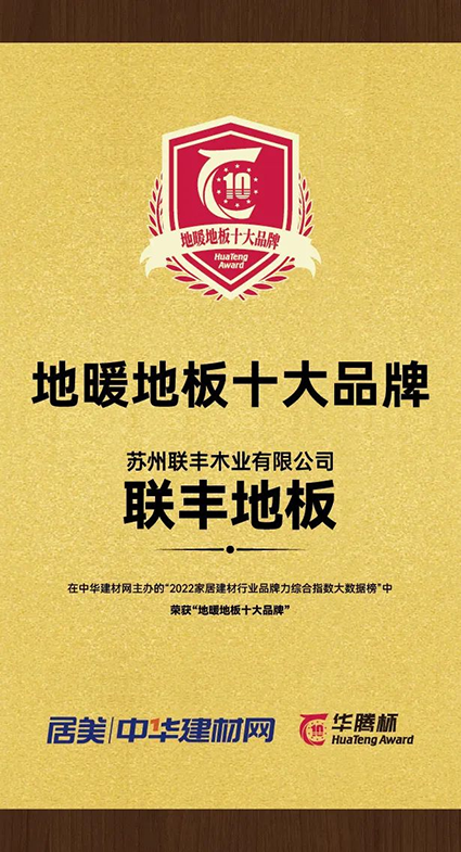 又是一年金秋月,又到碩果累累時(shí)。由中國(guó)家居建材行業(yè)綜合門(mén)戶|中華建材網(wǎng)發(fā)起并主辦的“華騰杯”——2022家居建材行業(yè)品牌力綜合指數(shù)大數(shù)據(jù)榜榮耀開(kāi)啟,家居領(lǐng)袖齊聚云端,共襄行業(yè)年度盛宴。38年榮耀品牌——聯(lián)豐地板品牌力綜合指數(shù)居高不下,成功斬獲“地板十佳品牌”、“地板影響力十大品牌”、“地暖地板十大品牌”。