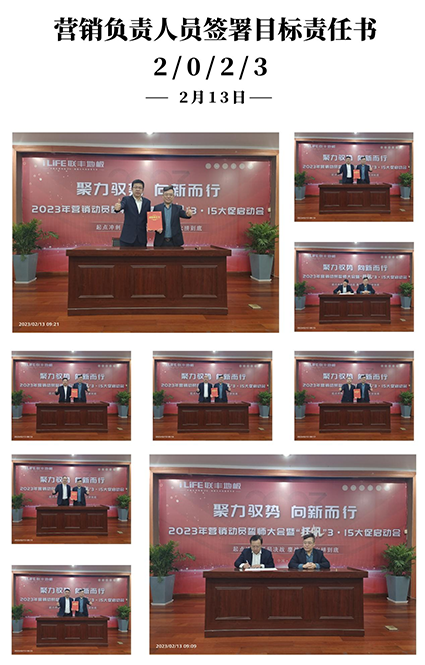 針對公司2023總體戰(zhàn)略布局,營銷中心各部門、大區(qū)負(fù)責(zé)人逐一上臺,簽訂年度營銷目標(biāo)責(zé)任書,大家紛紛表示,新的一年將始終保持緊迫感、使命感、責(zé)任感,全力形成一盤棋,擰成一股繩,以積極肯干、務(wù)實奮斗的精神狀態(tài)誓達(dá)目標(biāo)。