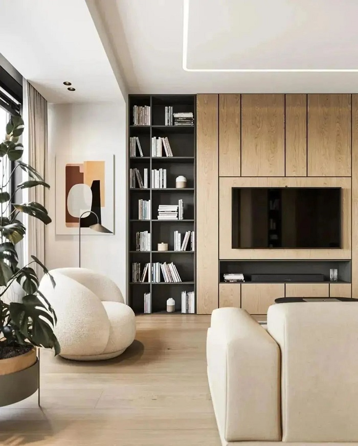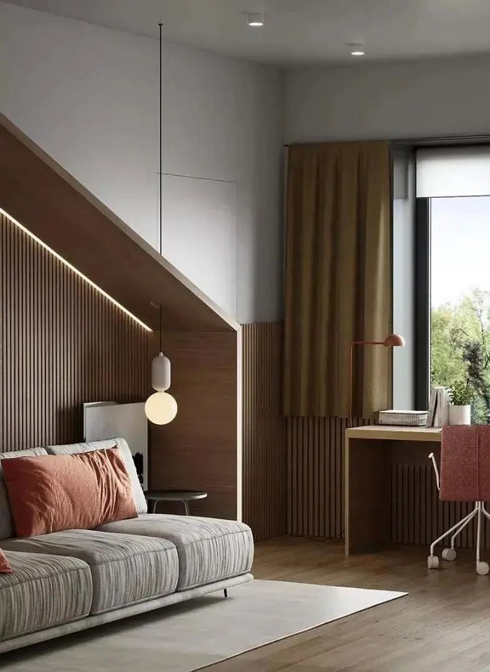 簡約灰白與原木色聯(lián)豐與之呼應(yīng)呈現(xiàn)出高級感,線條感貫穿在墻壁、書架之間的設(shè)計,搭配著春日生機昂揚的綠植,形成另一番愜意之感。